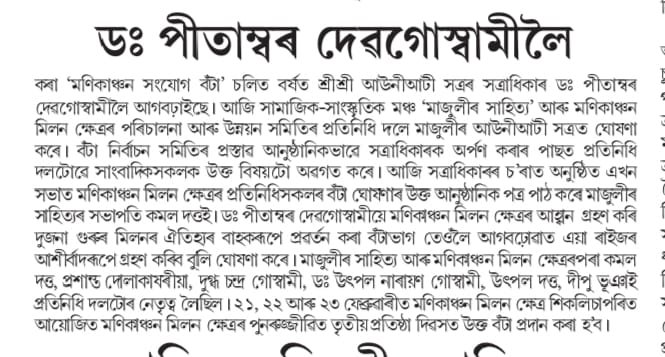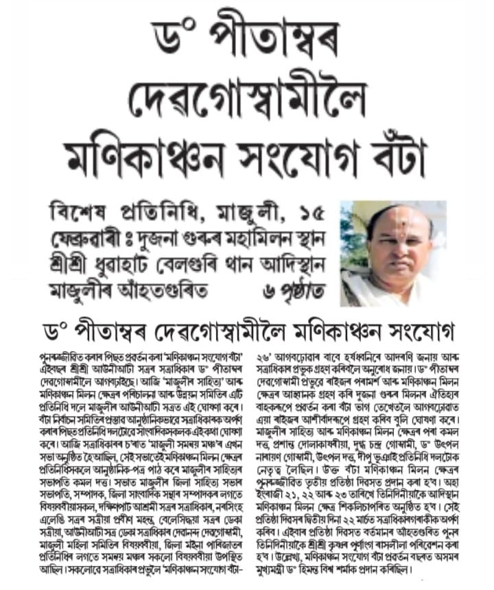 অহা ২৩ মাৰ্চ২০২৬ তাৰিখে শিকলিচাপৰিস্থিত শ্ৰীশ্ৰী ধূঁৱাহাট বেলগুৰি থান মণিকাঞ্চন মিলন ক্ষেত্ৰত ” আঁহতগুৰি উৎসৱ” তৃতীয় দিনাৰ মুকলি সভাত এই বঁটা প্ৰদান কৰা হ’ব। এইবাৰৰ উৎসৱৰ প্ৰধান আকৰ্ষণ হ’ব ২৫ বছৰৰ পিছত মূল আঁহতগুৰিত পূৰ্ণাংগ ৰাসলীলা মঞ্চস্থ হ’ব। ইতিমধ্যে মাজুলীৰ সাহিত্যই দুগৰাকী প্ৰশিক্ষক শ্ৰীউপেন ভৰালী আৰু শ্ৰীপাপুল শইকীয়াৰ দ্বাৰা প্ৰশিক্ষণ প্ৰদান কৰি থকা হৈছে।